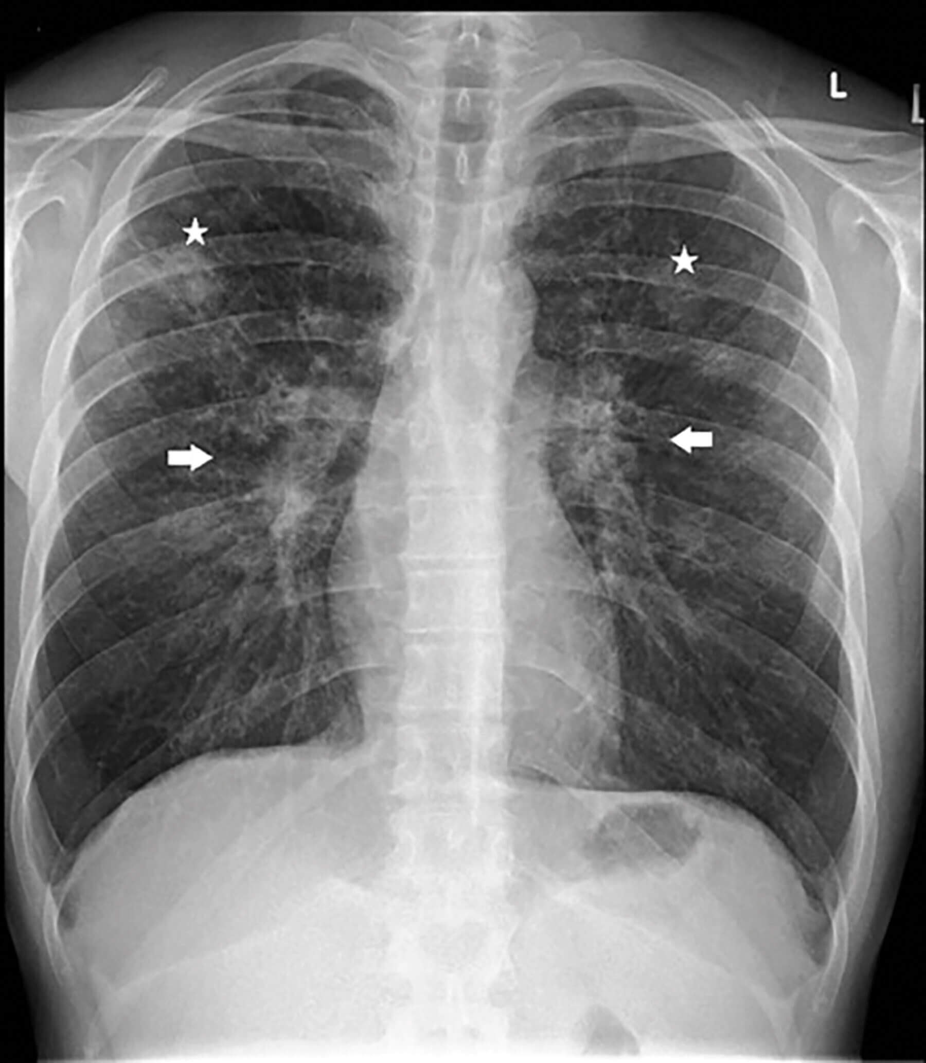 Figure 2: Chest X-ray showing nodular lung infiltrates (white asterisks) and bilateral hilar prominence