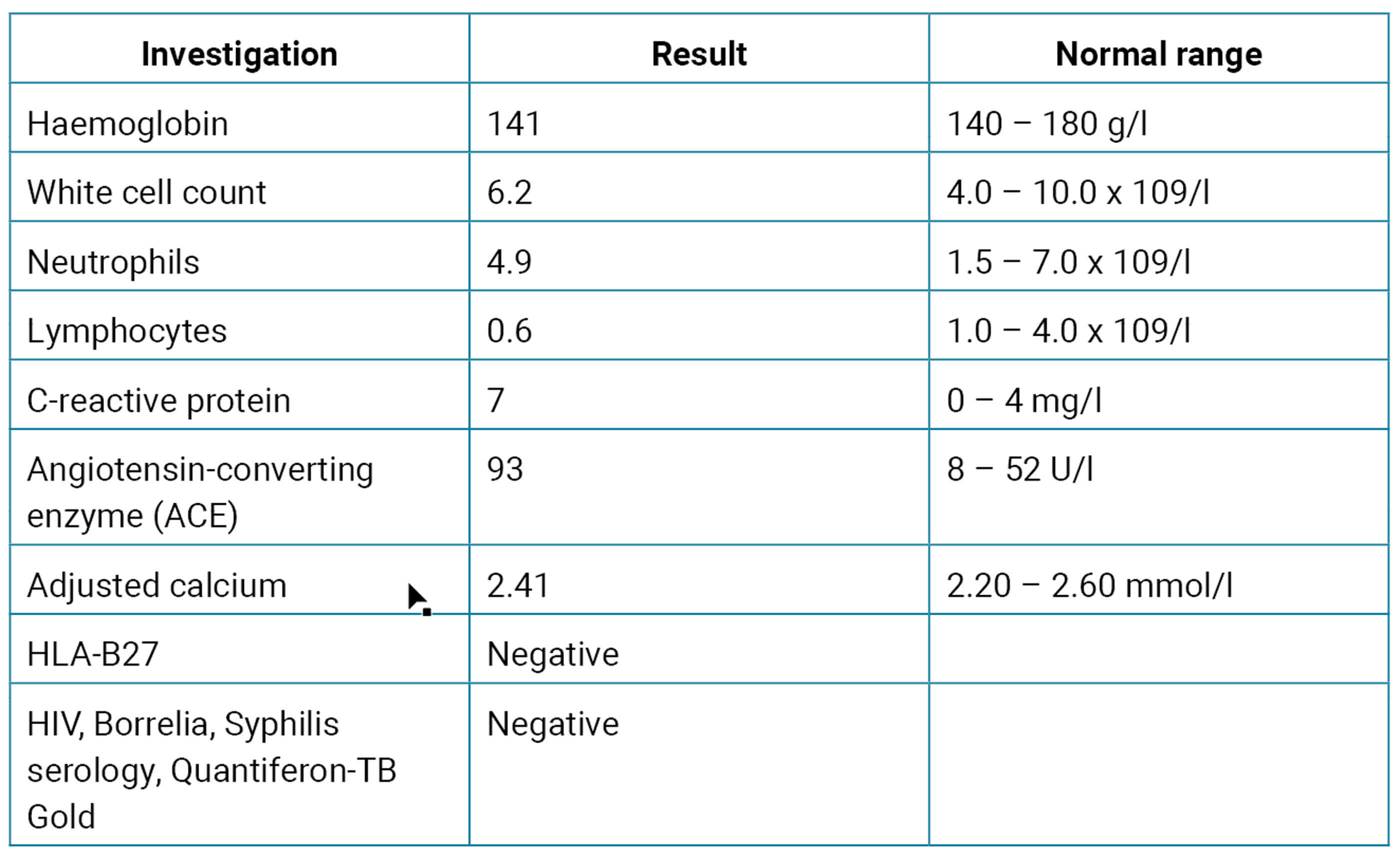 Table 1: Relevant blood results obtained to investigate for uveitis with systemic symptoms.