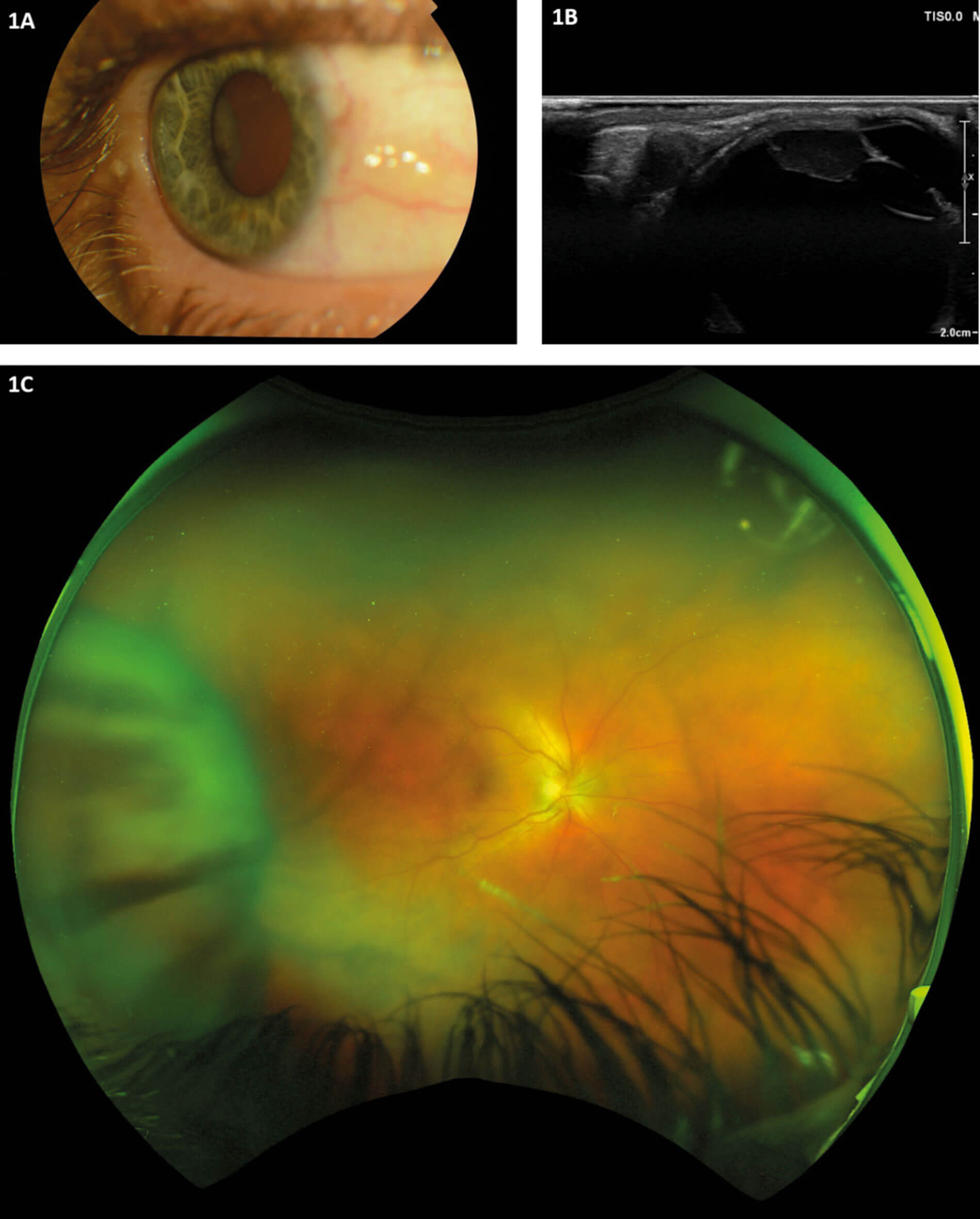 Due to the suspicion of possible neoplasia, he was referred to the regional ocular oncology service for presumed melanoma. Ultrasound biomicroscopy (UBM) was performed and confirmed well-defined mass continuous with the ciliary body temporally (Figure 1B), suggestive of melanoma.