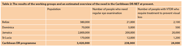 The DR-NET Toolkit revised specially for the Caribbean workshop provided a guide to working through the process of assessing and clarifying the need. In working groups, each partnership worked through a situational analysis, beginning with calculating the prevalence of diabetes mellitus, diabetic retinopathy and vision-threatening diabetic retinopathy (VTDR) within their region. This gave them a target of where they needed to be in terms of service delivery; estimating how many people need regular screening and how many people need treatment to prevent visual loss from diabetic eye disease.