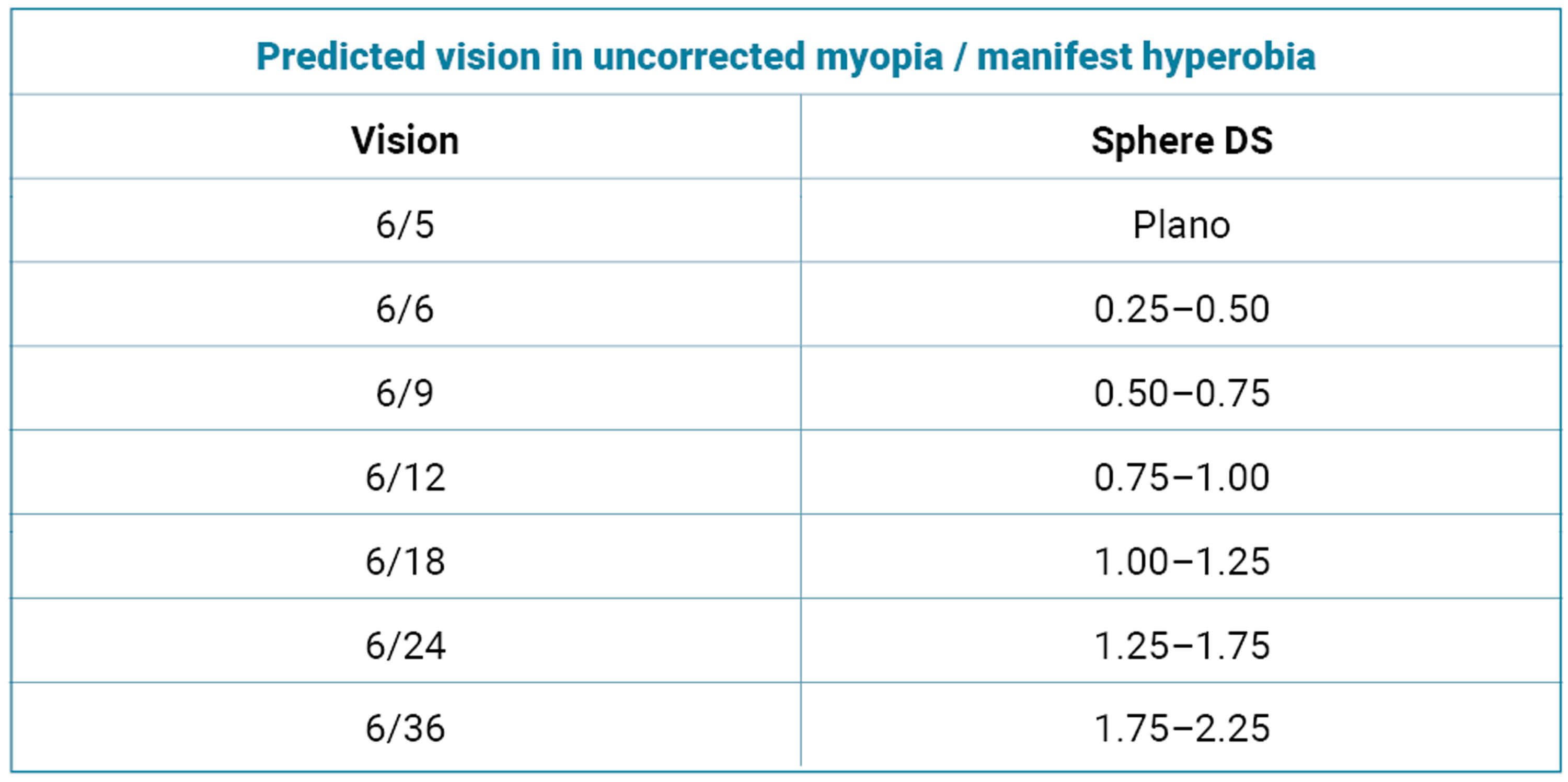 A good way to cut down on time is to consider the unaided visual acuity (VA) and have an expected prescription in your head before starting. For example: VA of 6/12 or +0.4 LogMAR should roughly have a mean equivalent sphere of 1D (each line being roughly 0.25). See Table 1 for more examples.