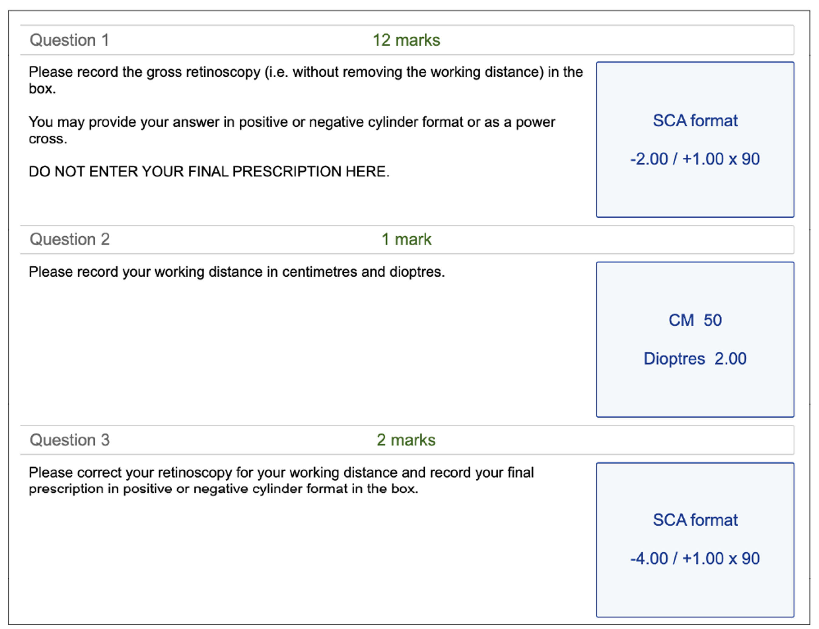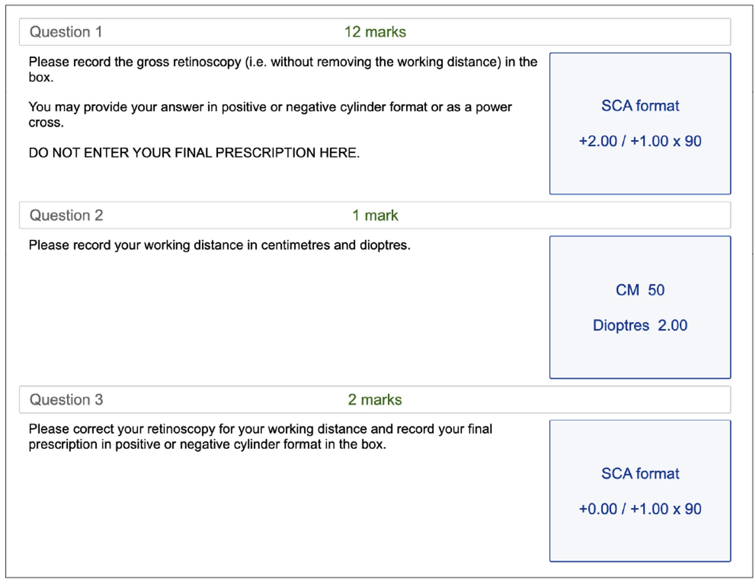 When you perform retinoscopy, the last step of the station is to remove your working distance from the lenses that you chose. When you’re in a high-pressure situation, small math errors can catch you out. Some candidates end up adding the working distance instead of removing it. Others mindlessly repeat the same values in both slots and fail to remove the working distance. After inserting the values, reread them to ensure they are correct. You might be surprised at how easy it is to miss such obvious mistakes which could cost you the whole exam. Please refer to Figure1 and Figure 2 for examples of how to correctly remove the working distance from plus and minus lenses.