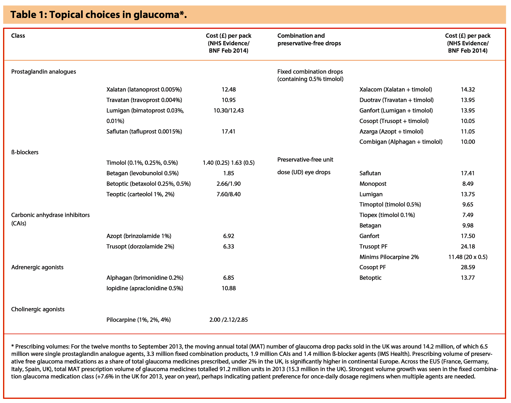 Compliance and persistence with glaucoma drops is notoriously poor. But, as the EGS notes, fixed-combination eye drops provide the potential for improved patient compliance and less side-effects due to a reduced level of preservatives. Combined preparations have also been shown to result in less ocular side-effects. Practitioners should exclude contraindications to ß-blockers when prescribing fixed-combination drugs containing a ß-blocker.