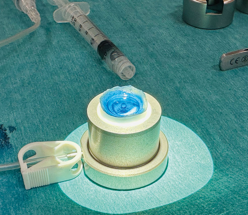 Trainees can enhance their corneal surgical skills in graft preparation and suturing on this remaining donor tissue. The skills include attaching the corneal button to the suction device (Figure 2); practising raising the edge of Descemet membrane to ensure the correct plane is achieved; and peeling the remaining Descemet membrane. The remaining edge of the tissue can be used to practise loading tissue into the loading device and injecting it.