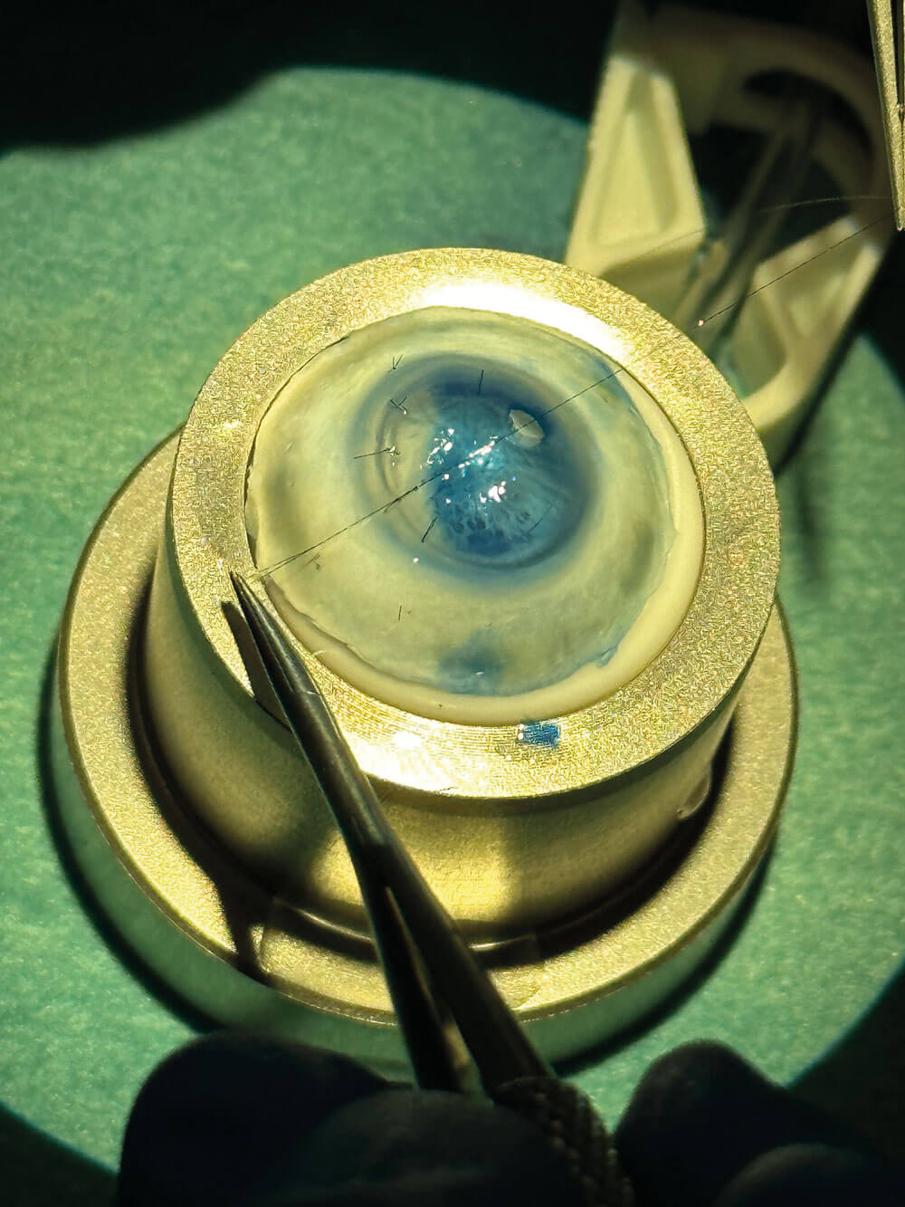 A further use is to practise cornea suturing by placing the tissue on the device with the epithelium facing upwards. A simulated penetrating laceration can be created, and cornea suturing techniques can be practised to close up this wound. The other ‘clean’ end of the 10-0 nylon suture can be used, again avoiding the use of further kit.