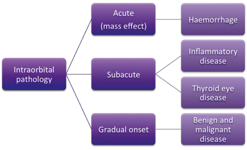 Orbital disease: Intraorbital pathology may be acute (haemorrhage), subacute (e.g., inflammatory disease, such as thyroid eye disease or idiopathic inflammation) or gradual onset (benign and malignant disease), noted David Verity (Figure 1). An acute rise in orbital pressure leads rapidly to ischaemia and visual failure, with a risk of chronic compromise in orbital function. Any process embarrassing venous outflow, or an acute process which compresses the globe, can affect glaucoma. Conversely, topical ophthalmic medication can lead to periorbital hollowing due to fat atrophy, a potentially disfiguring side effect [20]. Common pathologies in a tertiary referral unit are reactive lymphoid hyperplasia, lacrimal gland inflammations, myositis and scleritis, granulomatosis with polyangiitis, and IgG4 associated inflammation.