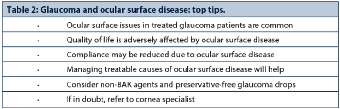 Romesh Angunawela observed that prevalence rates of ocular surface disease (OSD) in treated glaucoma patients range between 48.4% to 59.2% [6,7]. Moreover, severity of OSD symptoms is positively correlated with the number of IOP-lowering medications used. Topical use of benzalkonium (BAK) chloride causes corneal neurotoxicity, inflammation and reduced aqueous tear production, its effect is cumulative, and prolonged exposure results in cell death and disruption of the ocular surface [8]. Better control of OSD may actually improve compliance, and glaucoma specialists were encouraged to consider preservative-free topical medications for increased patient satisfaction and drop comfort, especially in younger patients (Table 2).