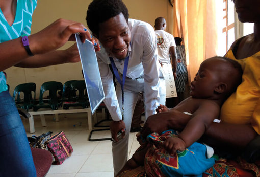 Checking visual acuity in a baby using the Malawi Livingstone preferential looking vision chart.
