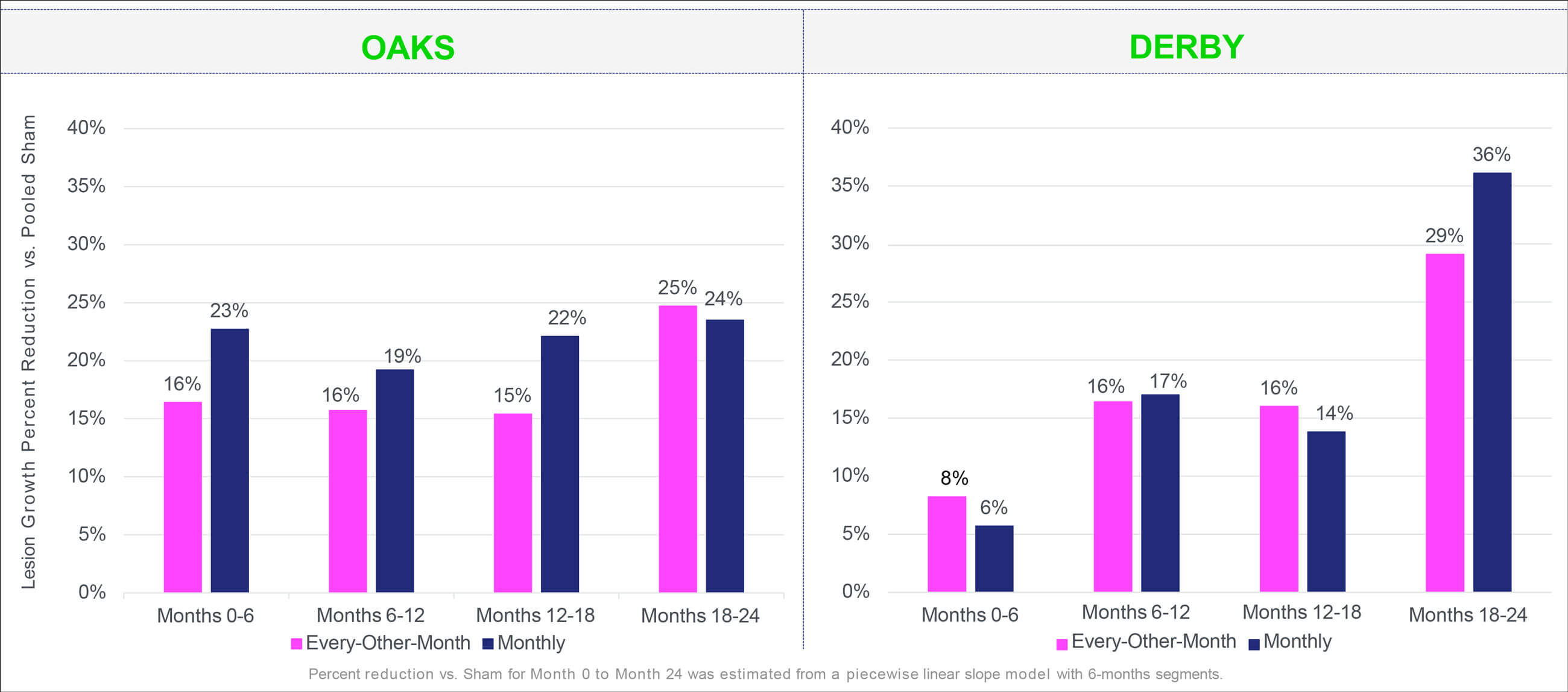 - PR loss reductions vs sham: every other month: 46% (OAKS; p<0.0001) and 46% (DERBY; p<0.0001); monthly: 53% (OAKS; p<0.0001) and 47% (DERBY; p<0.0001); and