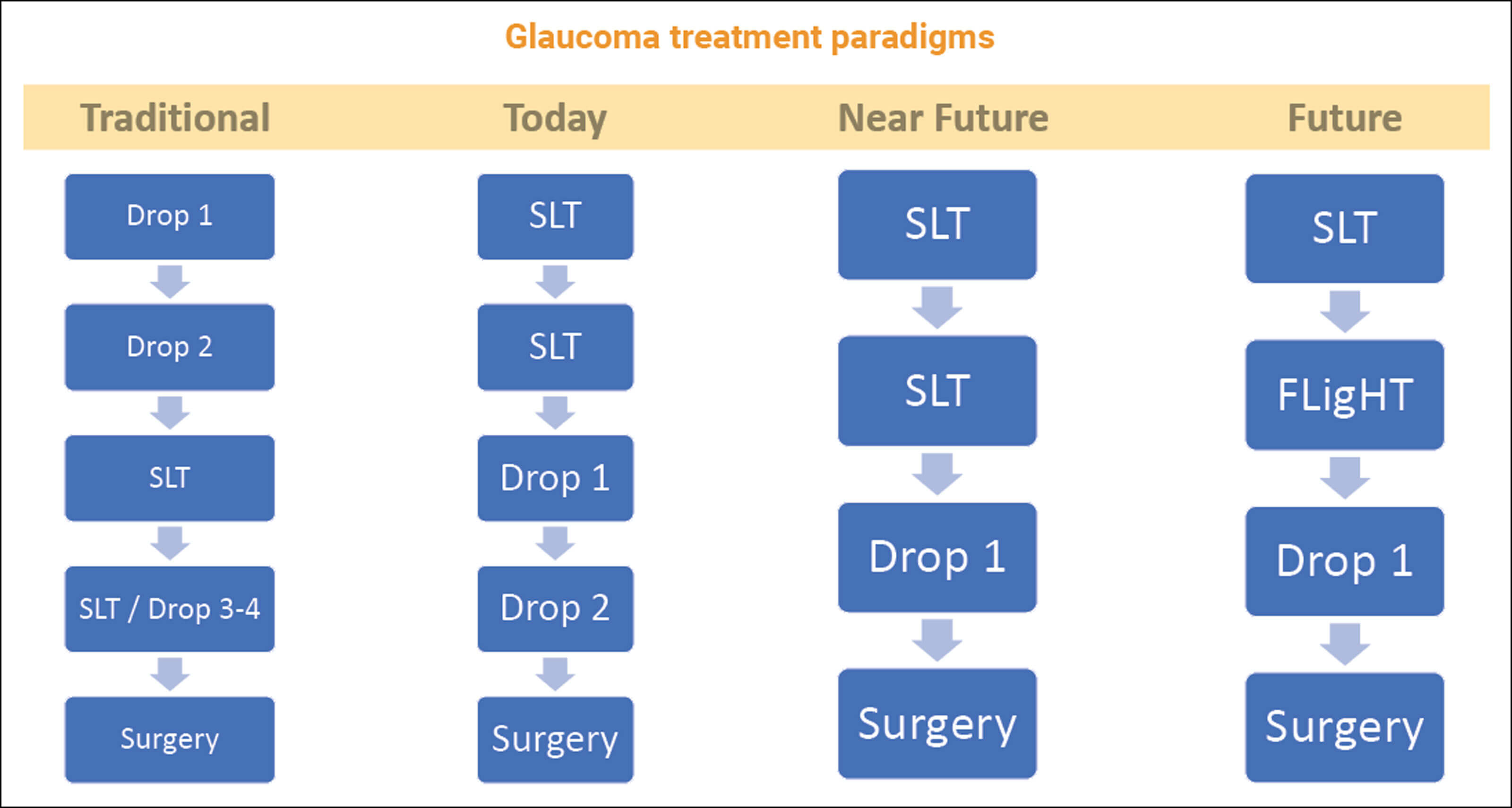 Traditionally, a newly diagnosed glaucoma patient would be treated first with medical therapy. As the disease progressed or the initial intervention failed to adequately control intraocular pressure (IOP), clinicians would add more drops, selective laser trabeculoplasty (SLT), repeated SLT and still more drops, with surgery as a last resort.