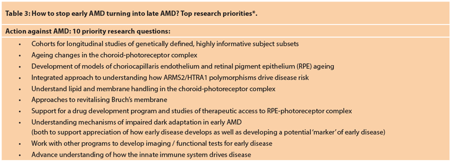 The Wellcome-funded conference identified top research priorities designed to lead as rapidly as possible to effective treatment(s) or strategies to prevent individuals with early AMD progressing to late AMD [9]. Table 3 summarises priority research questions from this initial global forum [9]. Infrastructure priorities include seed-corn funding, followed by development of academic and commercial partnerships and non-clinical researcher capacity building. The ambitious goal is to discover and develop an effective preventive intervention for early AMD within 10 years.