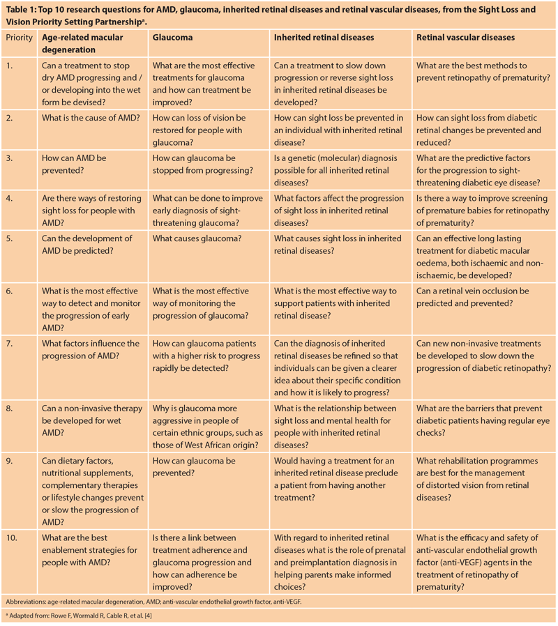 Michele Acton, CEO of Fight for Sight, explained that the charity’s new research strategy is to focus funding largely on four key strategic areas to maximise the impact of the work it supports: AMD, glaucoma, inherited eye diseases and sight loss related to other comorbidities, such as diabetes or stroke. Open call funding will still apply for all eye conditions. The top ten priority research outcomes established by the James Lind Alliance Sight Loss and Vision Priority Setting Partnership for common eye conditions are summarised in Table 1 [4].