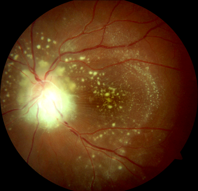 Visual acuity was 6/4 right and 3/60 left. There was a left relative afferent pupillary defect. The anterior segment of both eyes, intraocular pressure and right fundus was normal. Fundoscopy of the left eye showed a swollen disc, retinal folds and a striking array of circinate exudates in a peri-papillary and macular location (Figure 1).
