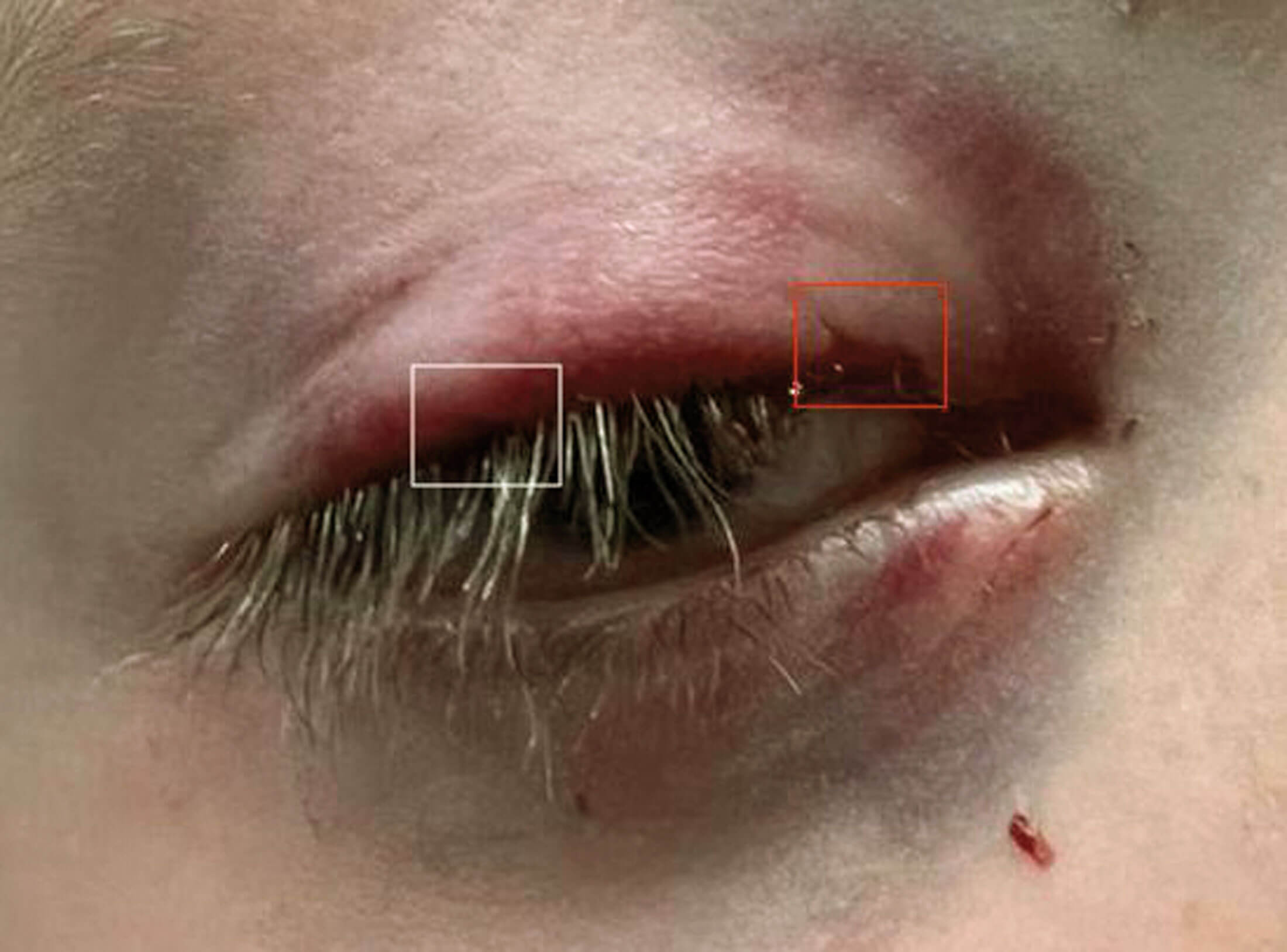 Figure 1: Preoperative photograph of the right upper eyelid showing two small lacerations to the eyelid margin highlighted by the boxes. The white box highlights the eyelid margin sparing laceration laterally and the red box highlights the eyelid margin involving laceration.