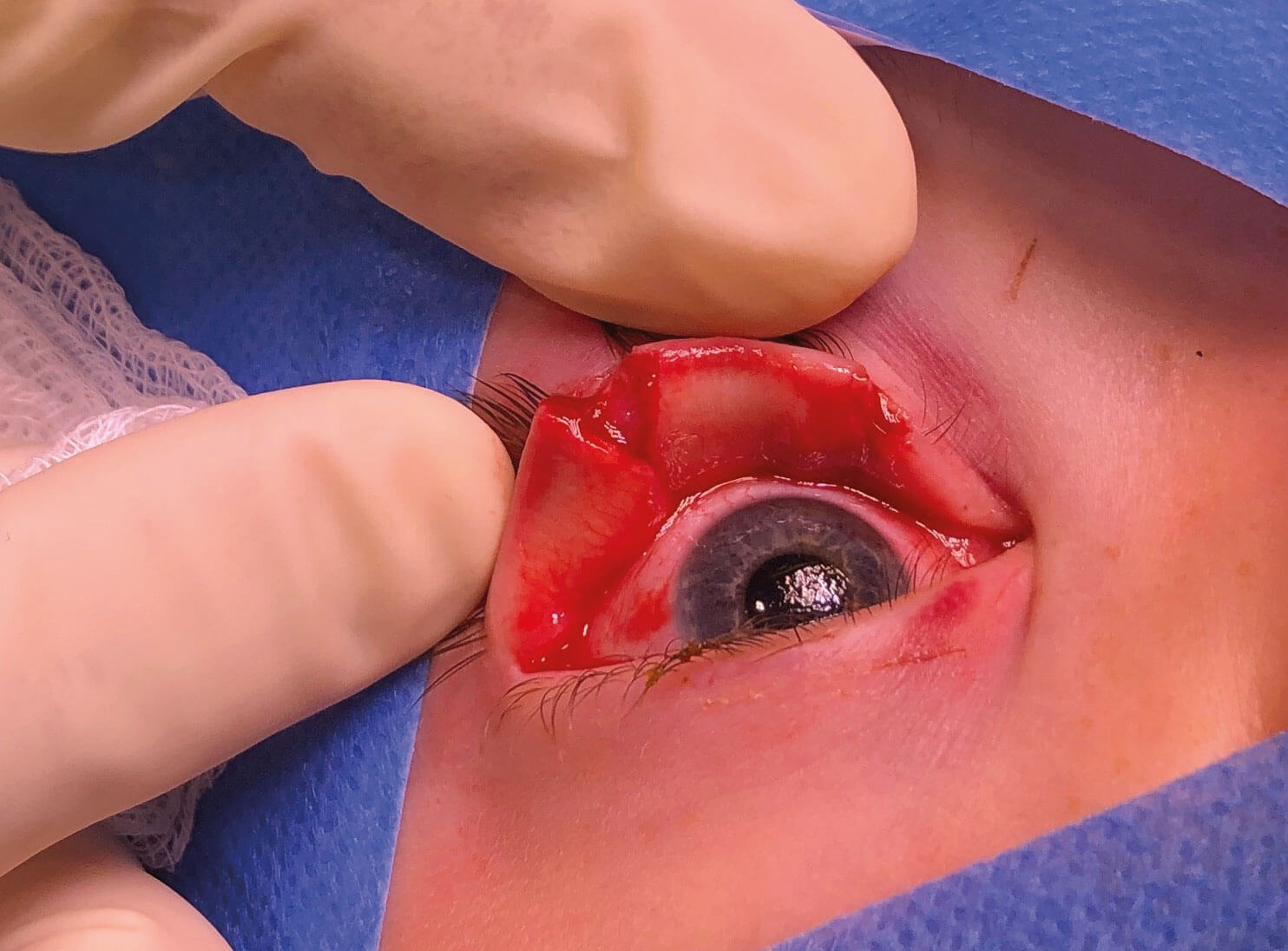 A child of primary-school age who experienced blunt trauma to the upper eyelid was referred to the oculoplastic team. He had run into a dog cage wearing his glasses, resulting in two right upper eyelid (RUL) lacerations involving the eyelid margin (Figure 1). On external inspection of the eyelid the injury appeared to be minor. Preoperatively the eye was examined and a laceration inside the RUL measuring less than 0.5mm was reported. There was active bleeding from that point, which was resolved with gauze and pressure application. The RUL was swollen, however there was no sign of injury to the globe.