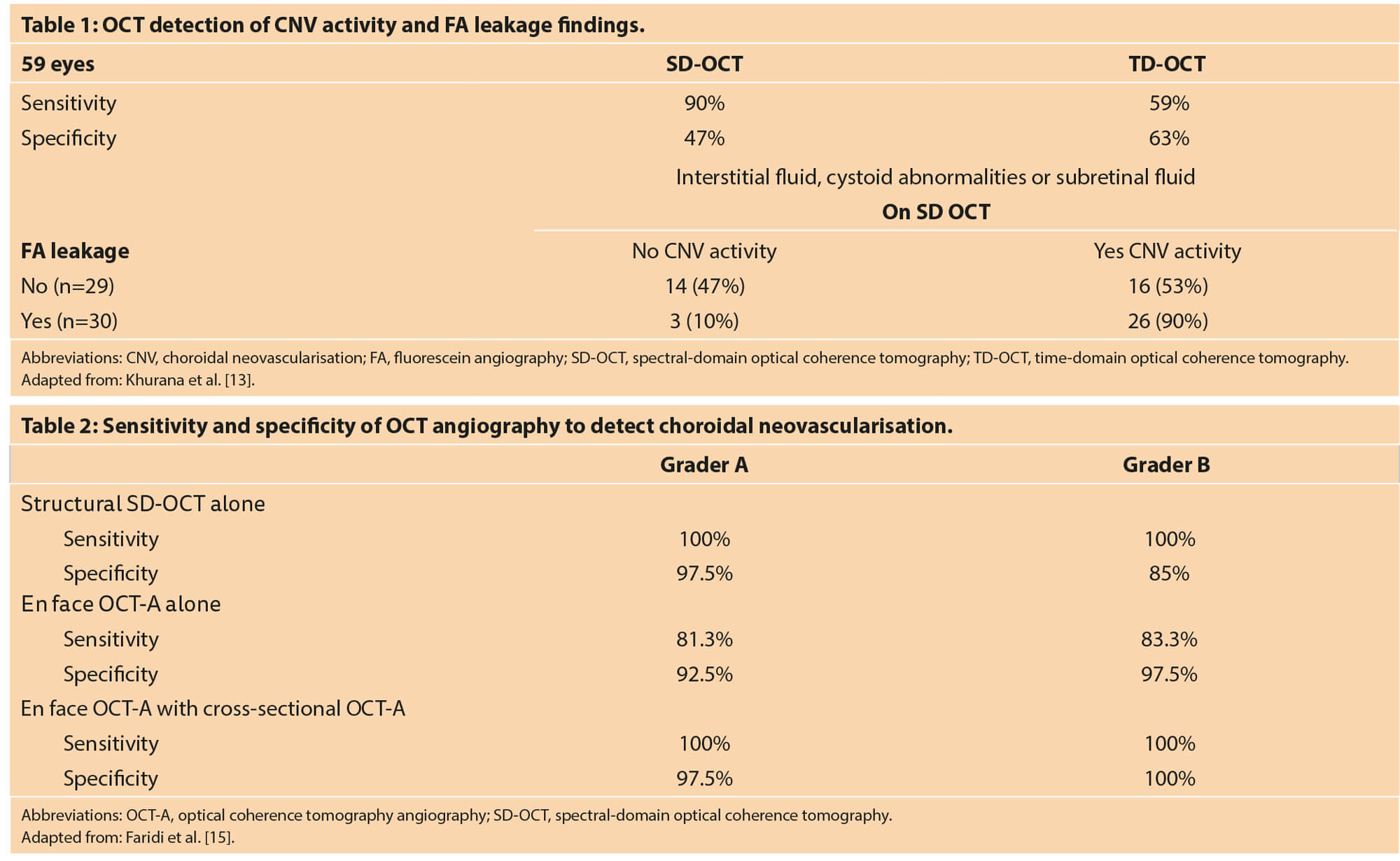 Faridi et al. found that structural OCT alone has excellent sensitivity for CNV detection, while false positives from structural OCT can be mitigated with the addition of flow information with OCT-A (Table 2) [15]. Fluorescein angiography may play an important role in making a baseline assessment of newly diagnosed nAMD but its role in follow-up is limited as it is difficult to determine CNV activity compared with OCT. Combining OCT with fundus imaging and OCT-A can be sufficient for the follow-up of most patients without the need for invasive FA. If in doubt, it is better to treat nAMD rather than not treat, Dr Udaondo added.