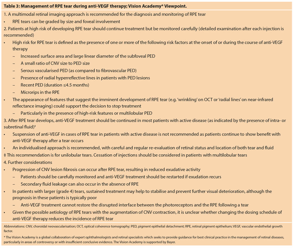Professor Anat Loewenstein, Tel Aviv University, Israel, summarised the Vision Academy viewpoint on the management of RPE tear during anti-VEGF therapy (Table 3). After RPE tear develops and for unilobular lesions only, anti-VEGF therapy should be continued in most patients with active disease. An individualised approach is recommended, requiring careful and regular re-evaluation of retinal status and location of both tear and fluid.
