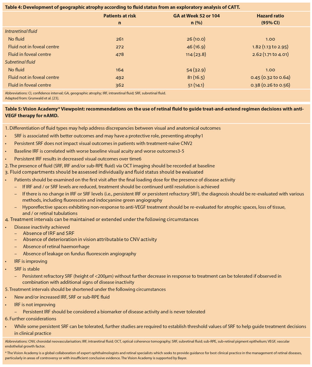Viewpoint recommendations from the Vision Academy on the use of retinal fluid to guide individualised treatment regimens with anti-VEGF therapy for nAMD were presented by Dr Neil N Bressler, Johns Hopkins University School of Medicine, USA, and are summarised in Table 5.