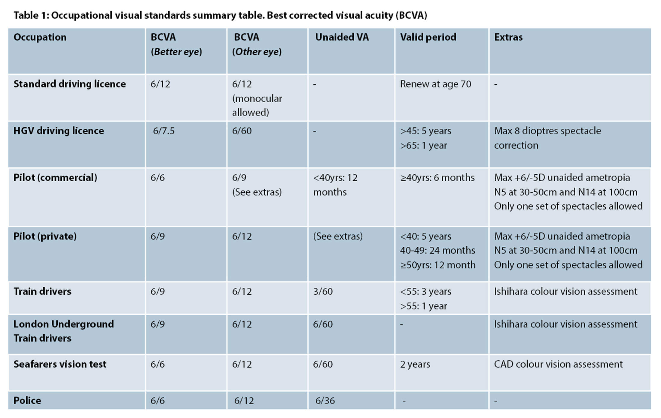 Given the differing demands of jobs requiring certain standards of vision and the resulting socio-economic importance, it is clear that a patient’s social and occupational history is very relevant. Many of the professions outlined in this article set out a best corrected vision of 6/6. Some require an uncorrected visual acuity that would likely discount many ametropic patients from even applying. Ophthalmologists should of course be familiar with visual standards for driving a motor vehicle. However, we should also be aware that there are visual standards for a range of occupations and consider how a diagnosis in the eye clinic may impact a person’s occupation and life.