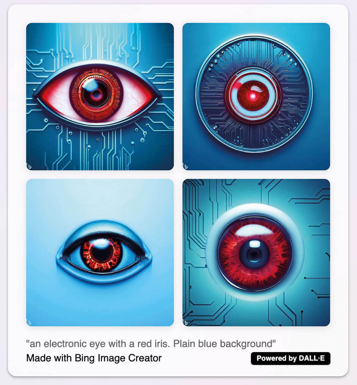 This service does drop contextual advertisements into the conversation, but not in a way that is concerning or misleading. The speed of Bing Chat is fairly fast, with waits normally being no longer than a few seconds. Bing Chat also has three modes: ‘More Balanced’, ‘More Creative’ and ‘More Precise’. ‘More Creative’ ties in another AI engine called DALL•E, also made by OpenAI. This tool creates images and art. It does not search the internet for images, it creates them. For example, I asked: “draw an electronic eye with a red iris. Plain blue background”. Figure 1 shows the high-resolution results it provided.