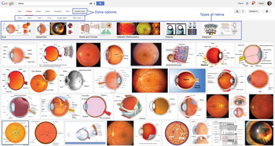 If you’re looking for ophthalmic (or other) images, Google continues to improve its image search. Image 2 shows a number of features that may not be immediately obvious. The area labelled ‘extra options’ shows the options that appear when you press the ‘search tools’ button. The tools allow filtering results by type, such as clip art or black and white. The ‘usage rights’ tools can be used to display images that are tagged allowing reproduction and or modification. The blue rectangle labelled ‘types of retina’ shows that the image search has broken the images of ‘retina’ down into several categories. The search is smart enough to be able to separate detached retina from diabetic and also from retina displays on Apple Mac computers. Pretty clever stuff.