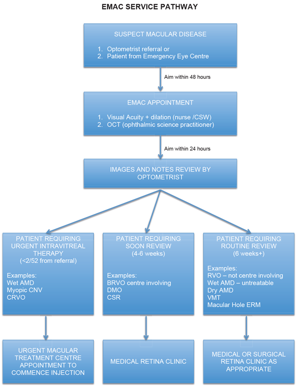 Figure 1: EMAC service pathway. EMAC, Emergency Macular; AMD, age-related macular degeneration; CNV, choroidal neovascularisation; CRVO/BRVO, central/branch retinal vein occlusion; DMO, diabetic macular oedema; CSR, central serous retinopathy; VMT, vitreomacular traction; ERM, epiretinal membrane.