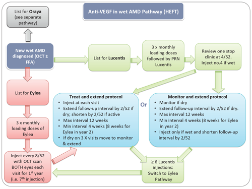 Newly-diagnosed wet AMD patients are offered anti-VEGF treatment with aflibercept (Eylea, Bayer) or ranibizumab, and adjunctive stereotactic radiotherapy for eligible eyes (Figure 4 and 5 show respective pathways). Treatment and care protocols are developed in collaboration with all ophthalmology personnel and revised or updated as necessary every six months. Injections are provided by all members of the medial retina team including a trained nurse injector. Two additional nurses are undergoing training for administration of intravitreal injections. Where possible, the first intravitreal anti-VEGF injection is given in the afternoon following the morning RAM clinic but otherwise within the next few days.