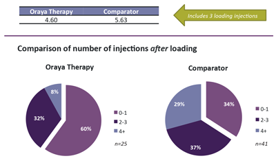 Figure 3: Anti-VEGF injections at 12 months after diagnosis and treatment start, as needed ranibizumab with and without (comparator) adjunctive stereotactic radiotherapy. Source: Courtesy of Mr Christopher Brand, Royal Hallamshire Hospital, Sheffield, UK.