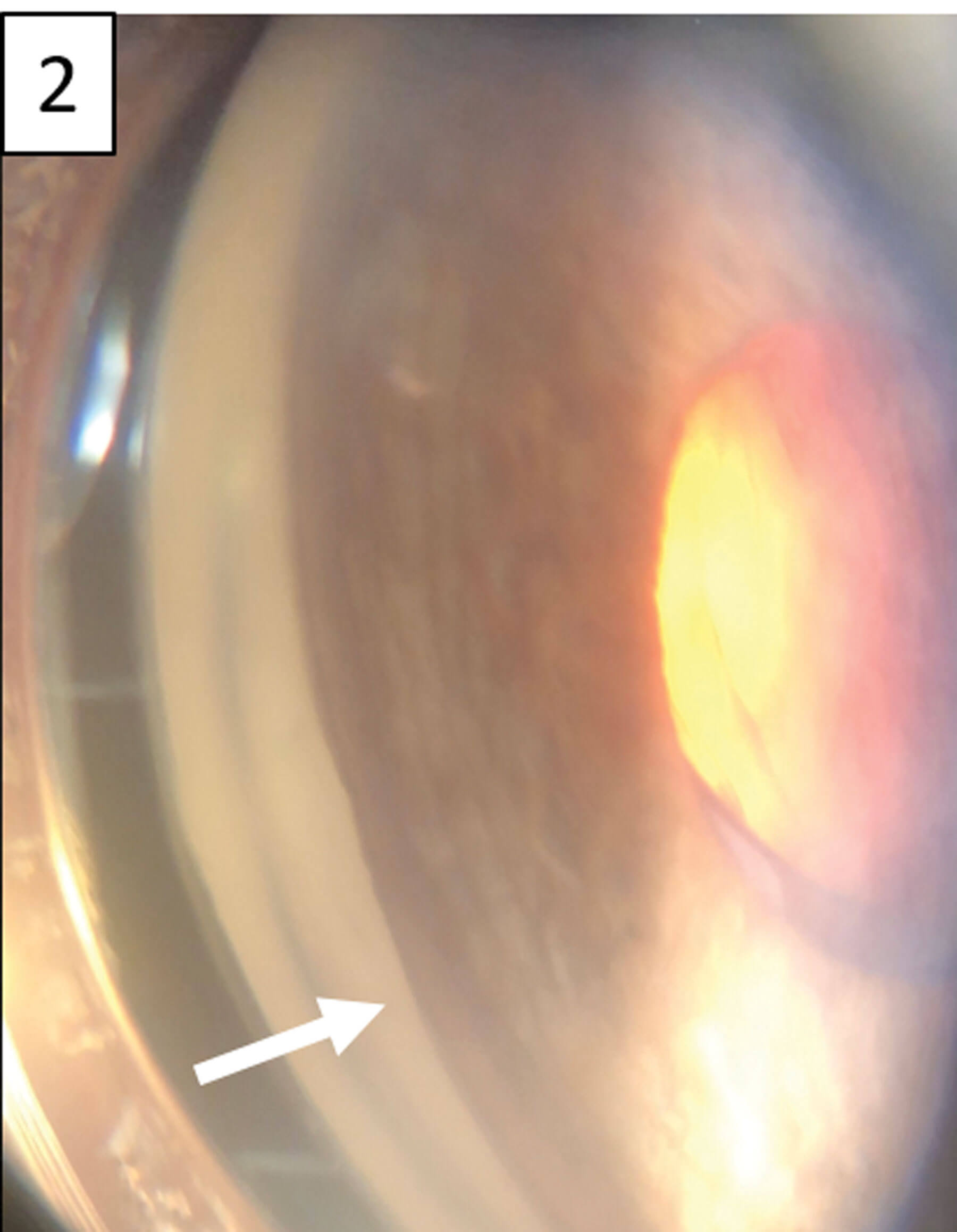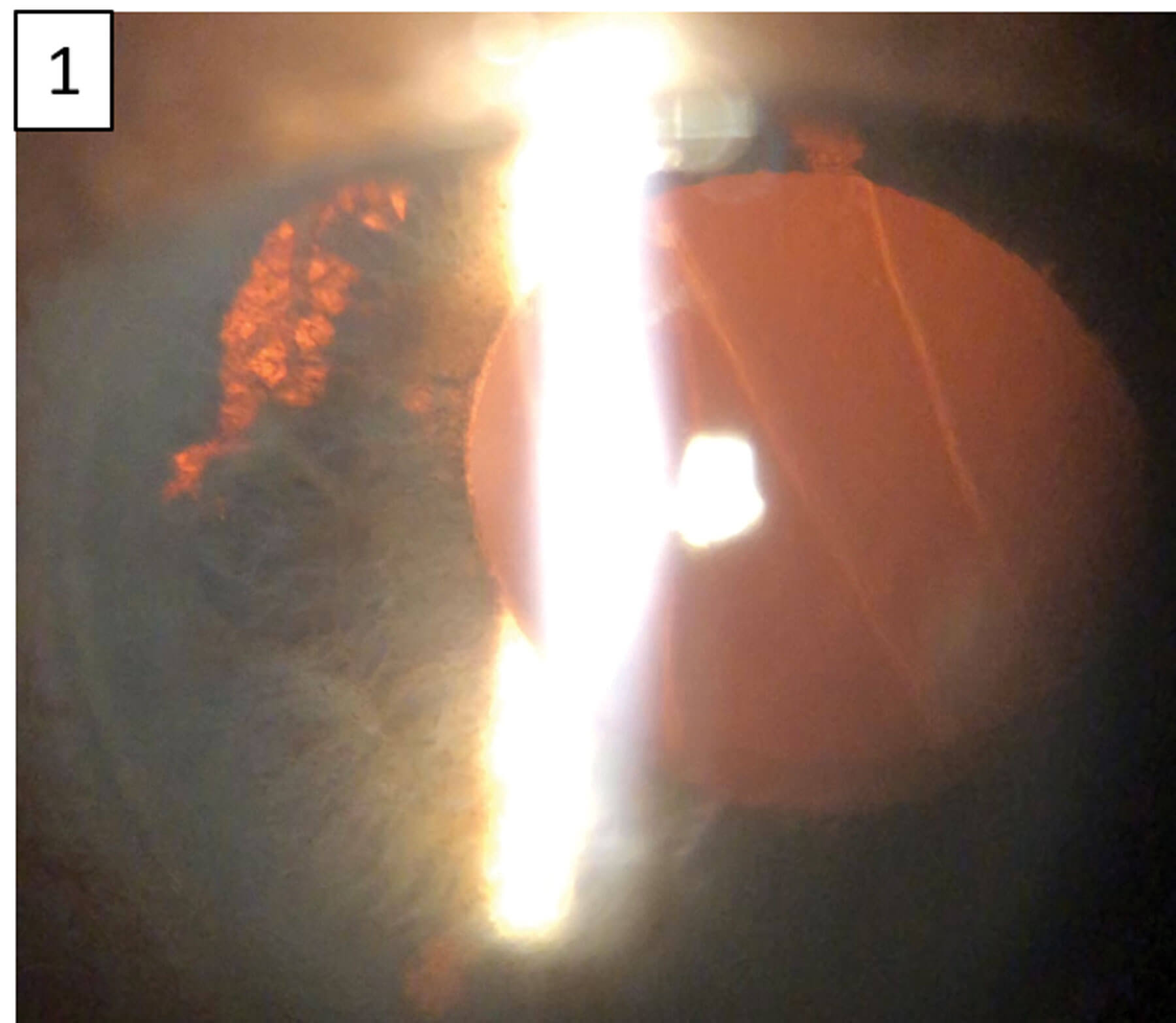 A 74-year-old man had persistent 3+ cell one month following left eye cataract extraction, complicated by anterior capsular rent and zonular dialysis at 7 o’clock, with single-piece acrylic intraocular lens implantation (IOL) in the capsular bag.
