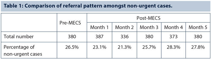 The percentage of non-urgent referrals was 26.5% pre-MECS and 25.2% post introduction of MECS. This difference was not statistically significant (paired T-test, p>0.05).