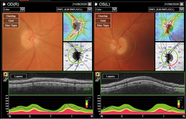 A 55-year-old man was seen in eye emergency clinic having been transferred from another hospital complaining of two weeks blurred vision in both eyes (left > right). His vision was 0.0 LogMAR (6/6 Snellen) in the right and 0.4 LogMAR (6/15 Snellen) in the left. He had reduced colour vision both eyes and constricted field defect left eye on confrontation. There was no relative afferent pupillary defect (RAPD) reported. Aside from small crowded discs, the rest of the ocular examination was unremarkable.