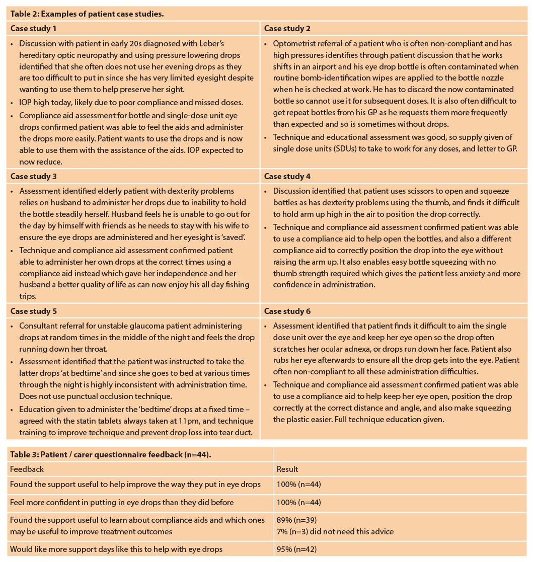With the numerous varied patient case studies already identified through this campaign (Table 2), it is apparent that a patient-specific approach is required to optimise adherence behaviour to eye drops, for new and existing patients and that there is not a one-size fits all training programme.