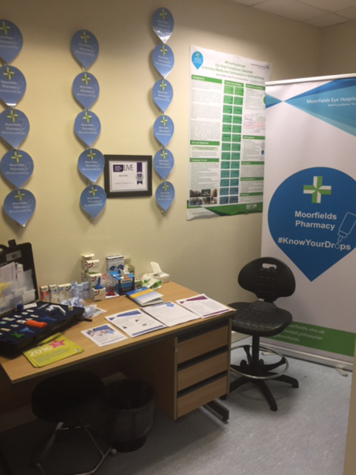Engagement with local clinical commissioning groups, GPs, community partners and local eye networks through the clinic liaison officers helped to raise awareness and invitation. The consultant opens the session by speaking about compliance and eye drop techniques to all patients / carers, inviting everyone to talk to us for a review and advice. We integrate with the clinic team delivering a specialist pharmacist-led consultation, which features a medicine utilisation review, by assessing patients to achieve best techniques, raising awareness of compliance, and demonstrating compliance aids. We have an eye catching patient-facing stand with information, videos and compliance aids.