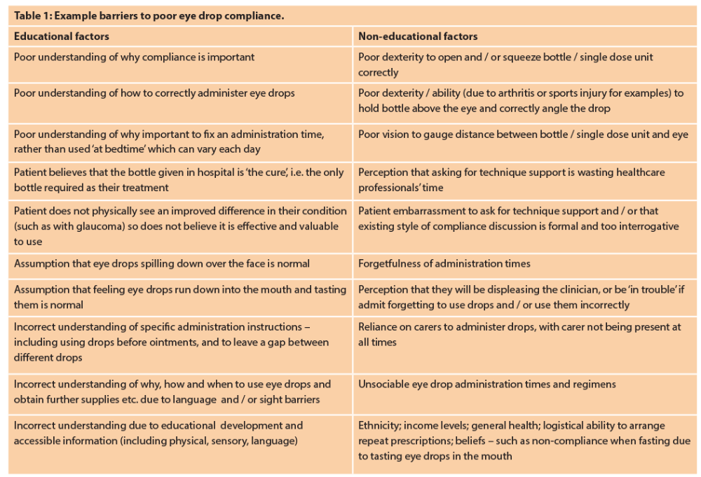 Aside from support on an educational level about treatment regimens, plans and patient concerns, support for correct eye drop technique and consideration of ophthalmic compliance aids is often overlooked outside specialist ophthalmic units. This type of treatment technique support differs widely when compared to other specialist medicines, for example, inhalers, where dedicated time is usually spent assessing, reviewing and continually supporting technique both in primary and secondary care. Eye drop technique support, however, is also essential, since treatment does not always improve sight (often a motivator to use drops correctly) but can prevent disease progression, such as glaucoma. Up to 50% of glaucoma patients are non-compliant with treatment [3] and given the consequences of treatment failure, it is vital to consider reasons for non-adherence and implement individualised measures of support to help overcome these barriers (Table 1). In turn, poor clinical outcomes, unnecessary polypharmacy and / or financial losses can be minimised, thus benefitting not only the patient / carer but also the NHS.