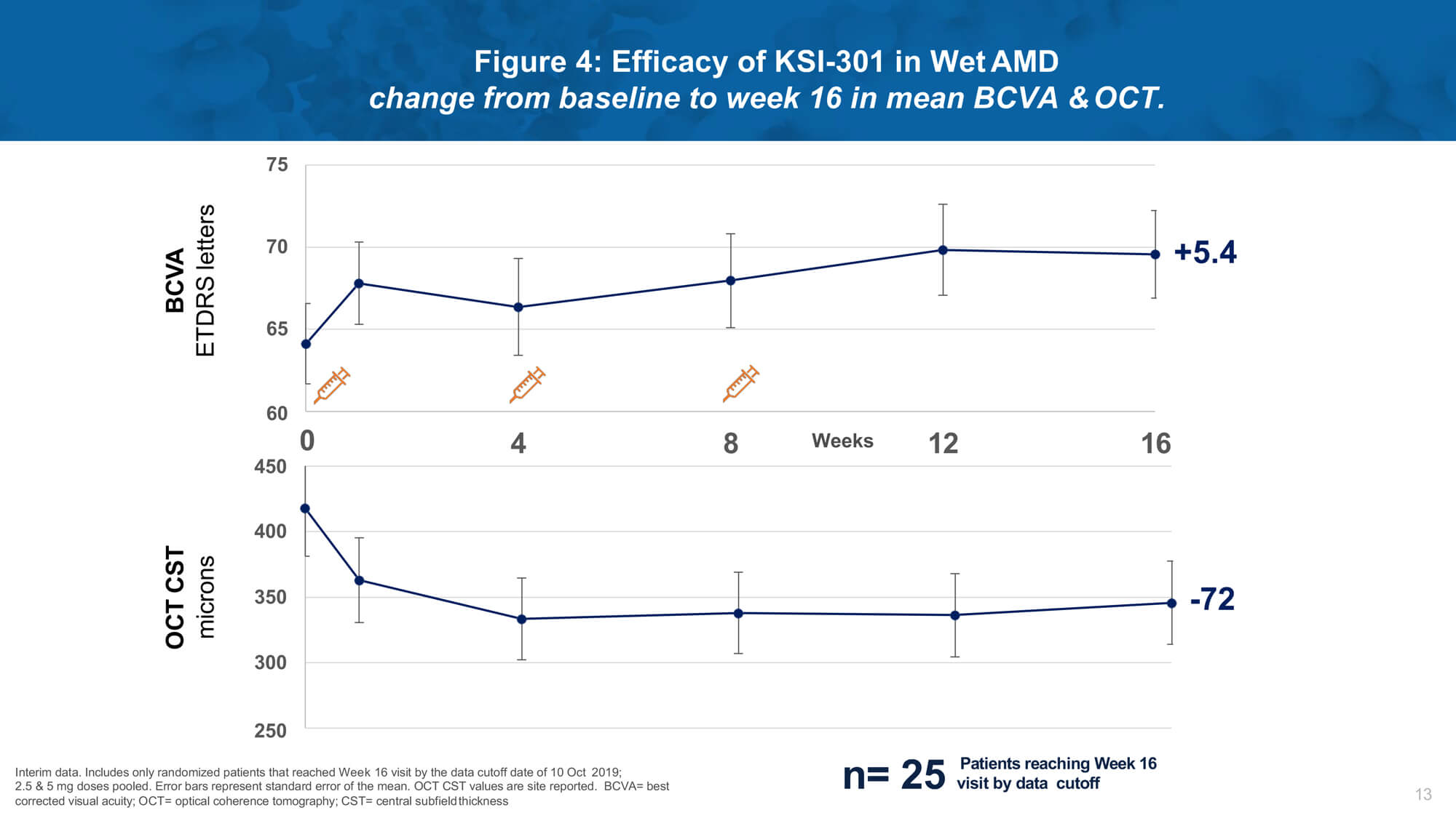 Remarkable biological durability was observed, with a majority of treated eyes extended to four months or beyond without requiring retreatment after three loading doses. A phase 2 study (DAZZLE) will evaluate KSI-301 5mg dosed every 12 to 20 weeks compared to aflibercept 2mg every eight weeks after three initial monthly loading doses in treatment-naïve nAMD patients.