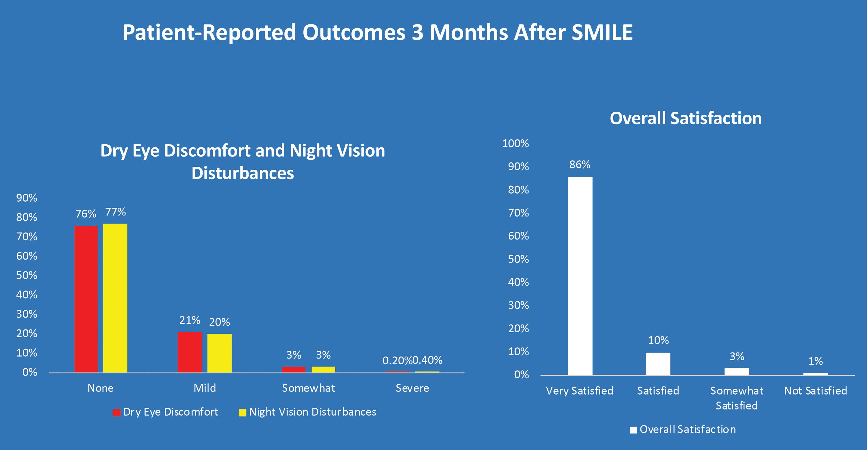 Overall, our patient-reported outcome measures showed very high patient satisfaction with SMILE surgery (greater than 95%) and few severe night vision disturbances and dry eye complaints (less than 1%).