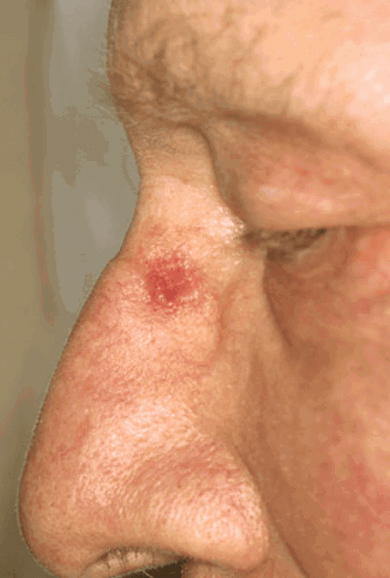 Ill-fitting spectacles are not only uncomfortable for the wearer but they may actually damage the delicate skin and give rise to spectacle acanthoma due to poorly fitting spectacles and / or hearing aids. In my many years in practice, I have witnessed basal cell carcinomas in patients which have initially been hidden by and later aggravated by spectacle wear (Figure 4), especially around the bridge of the nose [3]. All registrant opticians, whether DO or optometrist, have a duty of care to their patients. If they suspect any such skin irritations / conditions they should refer the patient to an appropriate medical practitioner in order that their concerns may be investigated.