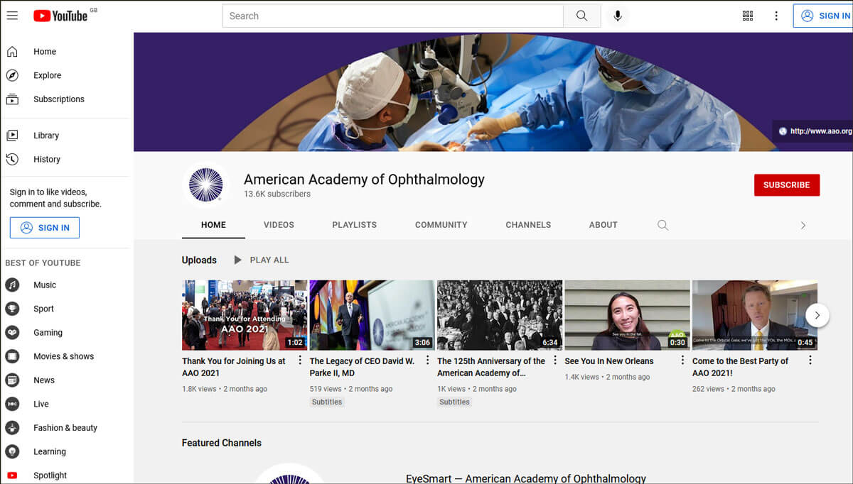 The American Academy of Ophthalmology (AAO) is the world’s largest association of eye physicians and surgeons working to protect sight and empower lives. Their YouTube channel contains videos covering various topics such as career choices, conferences, clinical knowledge, examination techniques, COVID-19 and the changes to the lives of ophthalmologists.
