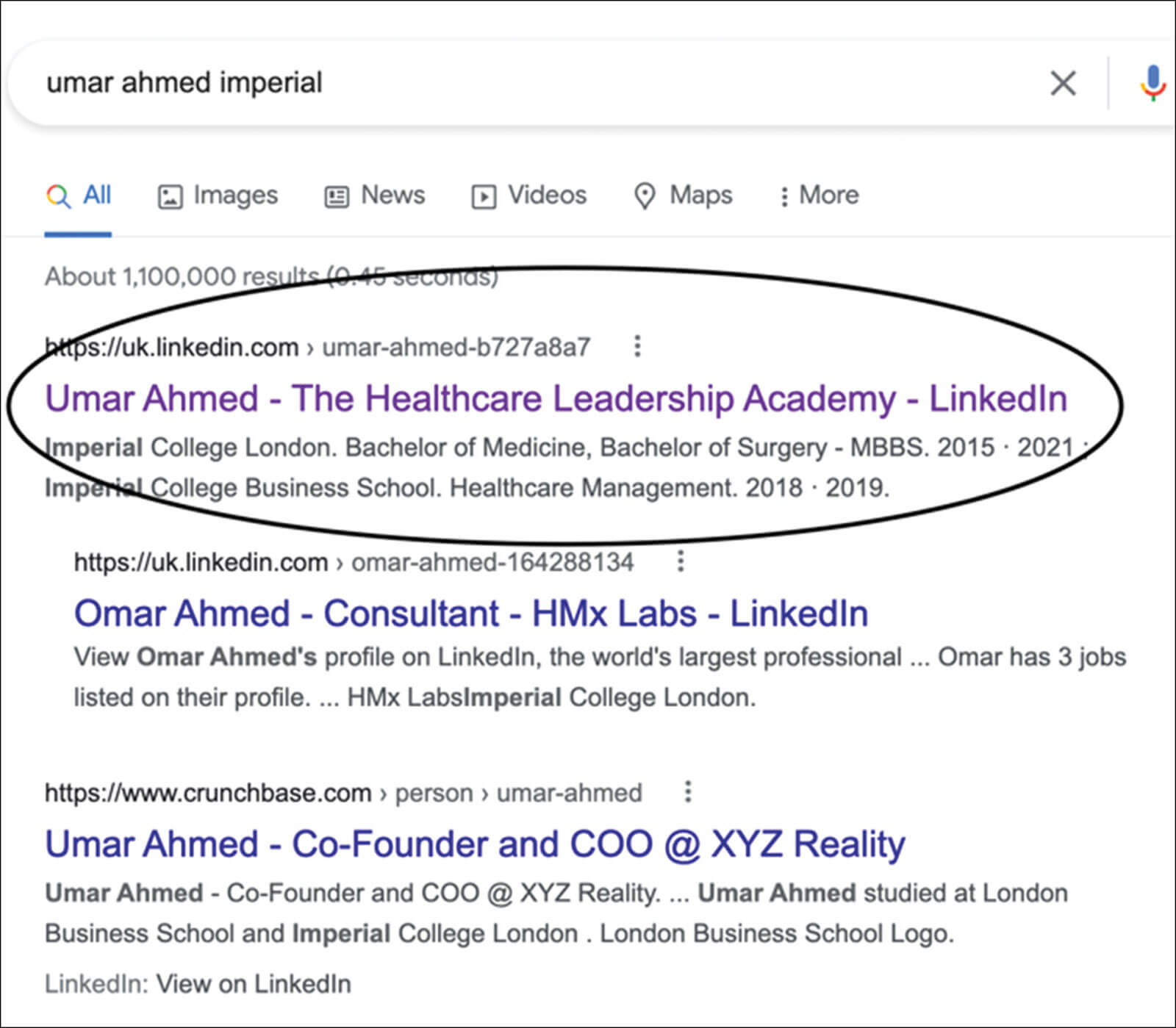 On the top you can see a clear history of the positions held by myself, which needs some updating! Further down on that page you would also be able to see other sections such as education, skills, recommendations, making LinkedIn a good way to keep an up-to-date CV and keep track of your achievements. The image on the bottom shows when you search my name with another keyword. You can see my LinkedIn profile comes up first in the Google search engine, giving me control of my online presence.