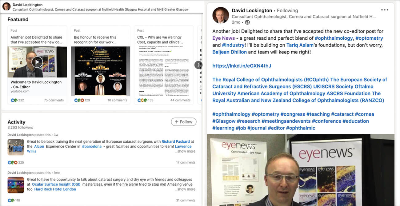 LinkedIn also gives you a voice. It allows you to engage with networks, groups, and communities on the topics within ophthalmology that interest you. It also gives you the opportunity to post and discuss projects and research you do with your peers, as well as educate your peers. All of which, again, will contribute to your online presence. The more active you are on LinkedIn, discussing about your specialty or interest, the more it will provide further opportunities. It can help demonstrate that you have specialist knowledge in your subspecialty, creating potential opportunities to speak at events and conferences.
