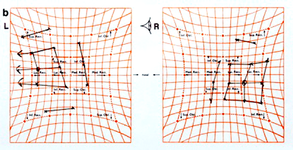 Figure 1: Hess Chart demonstrating under-action of the right ocular muscles with reduced adduction, elevation and depression. Right abduction appears spared. Note the centre of the box in the right eye is shifted outwards temporally and depressed, highlighting the right exotropia and hypotropia.