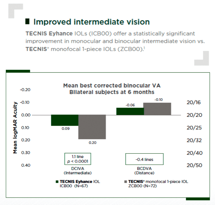 “Preliminary impressions of visual performance from my own case experience implanting the Tecnis Eyhance IOL is that uncorrected visual acuity is better than that typically associated with other monofocal IOLs and that patients experience good intermediate vision when emmetropia is achieved.”