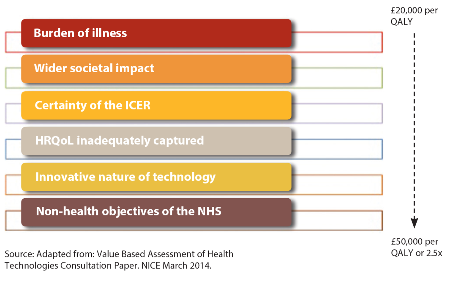 These two new ‘value elements’ will be used as additional modifiers by appraisal committees to help decide whether to recommend a technology with an incremental cost- effectiveness ratio (ICER) above £20,000 per quality-adjusted life year (QALY), subject to a proposed maximum weighting of 2.5 or a £50,000 ceiling.