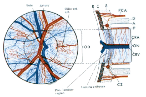 - Behind is the retrolaminar area supplied, as are layers two and three, by the posterior ciliary arterial system, the central retinal artery only supplying the surface layer (Figure 1).