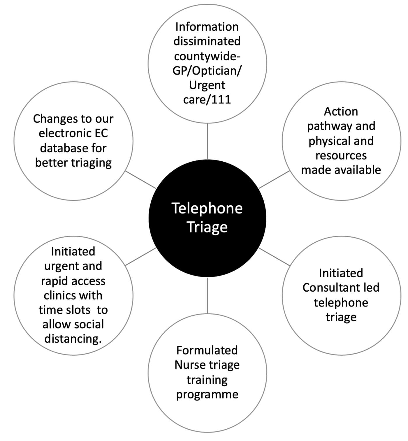 We established a countywide communication with all referral services (GP / optician / urgent care centre / 111). They were made aware that we were no longer a walk-in service and any referrals would need a telephone call prior to being accepted to be seen in the EC. To make this more feasible, physical resources were acquired, such as additional landlines and a mobile phone for emergency calls, as well as web cams on computers, to support our video consultations.