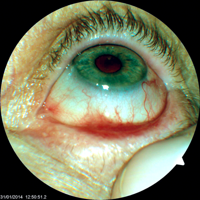 Oral dapsone was commenced 50mg once daily as well as tear supplements. An urgent rheumatology review was requested. The dapsone was increased to 100mg once daily at subsequent review and topical lubricants were also commenced. At eight weeks active disease was still evident and the patient was commenced on corticosteroids by the rheumatologists as well as calcium and vitamin D supplementation, along with bisphosphonate therapy. This controlled her oral disease but not her ocular changes. She was therefore commenced on azathioprine 2mg/kg/day in addition to her corticosteroids and remains symptom free since with no evidence of active ocular disease.