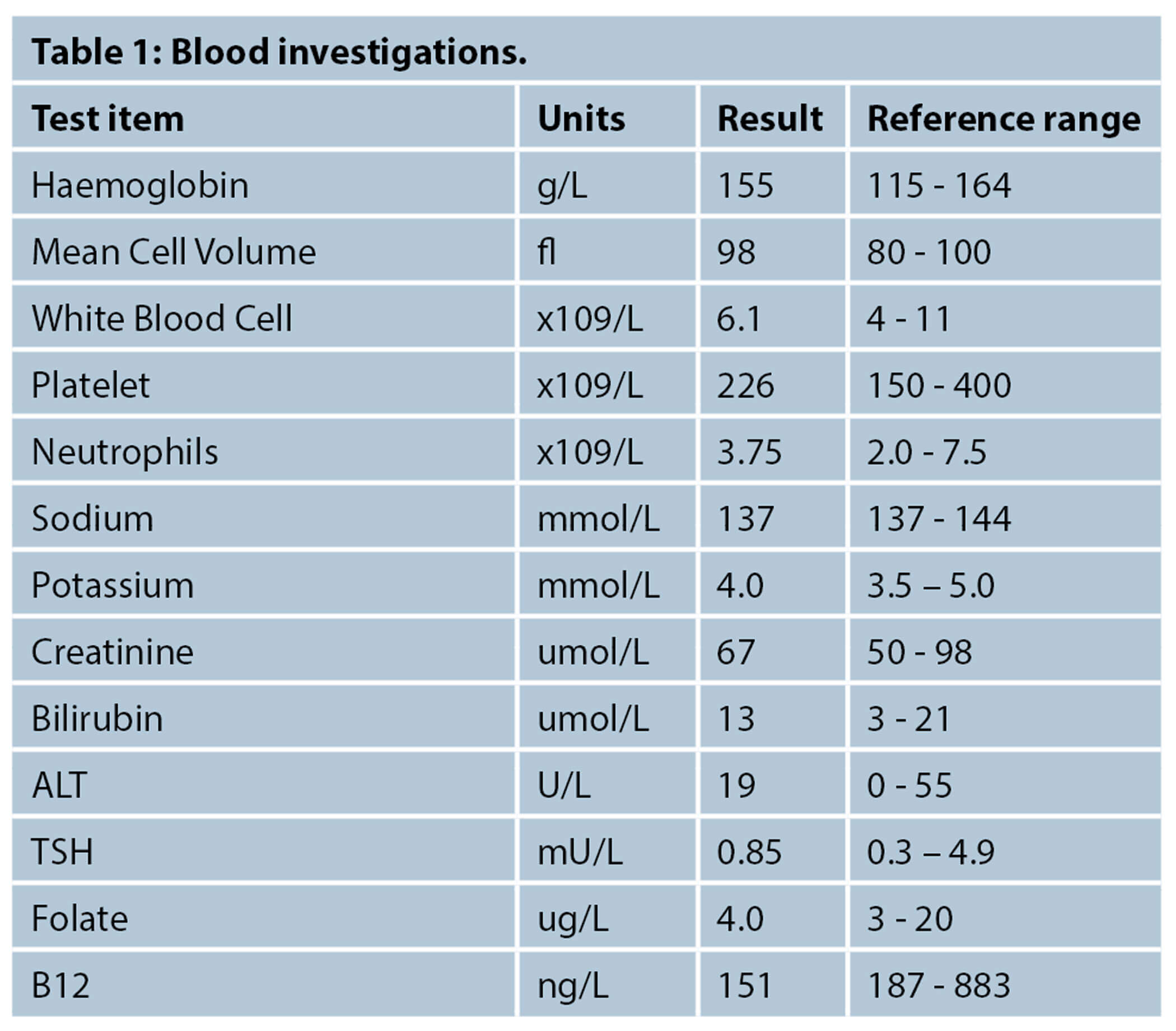 She was admitted under the Neurology team and underwent extensive investigations which returned normal results including a CT head, CT head angiogram and non-contrast MRI head. Her blood tests, included below, were essentially unremarkable other than a significant B12 deficiency 151ng/mL (200-883ng/L).