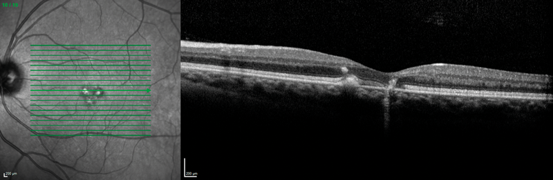 The reason I cannot decide whether the patient is a he or a she is that s/he is in the end stages of preparing for her gender reassignment surgery from woman to man, and for that purpose was already having Testosterone 1000mg gluteal injections every three months. Shortly after the injection treatment was initiated around two years ago, the eye symptoms started with reduced vision (being 6/12 to both eyes when I saw her) and metamophorpsias. For comorbid ankylosing spondylitis and schizophrenia the patient was also on Pregabalin and Quetiapin. Prior to referring to us, the endocrinologist had arranged for an MRI scan, which returned entirely normal findings.