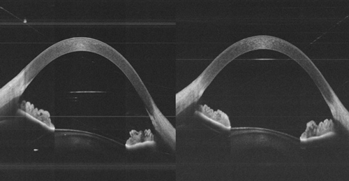 Figure 2: Binocular, simultaneous imaging allows automated, quantitative pupillometry using OCT (the images shown are from the binocular OCT prototype device currently undergoing clinical testing in Moorfields Eye Hospital).
