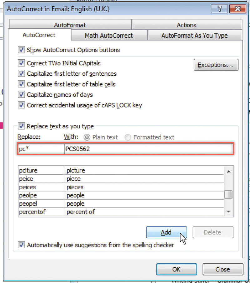 Enter the trigger word (e.g. pc*) in the ‘Replace’ box and the text you want to appear in the ‘With’ box (Figure 5) and press OK. Including a * in the trigger word is a good way to avoid mistakenly activating the autocorrect.
